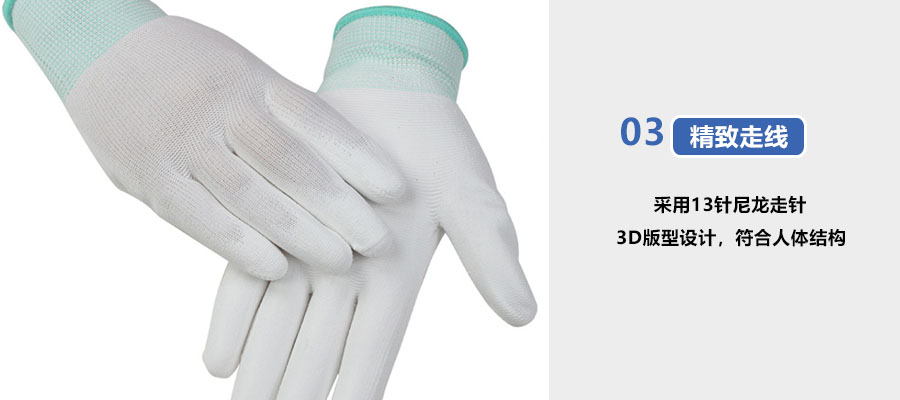 PU涂層手套又稱PU涂膠手套,根據(jù)涂膠的部位分為PU涂指手套、PU涂掌手套。其制作方法是在針織尼龍手套的手指或手掌部位涂上一層PU樹脂,這樣既增加了防滑性能,又增加了隔熱性能,同時能防止人體手掌的手汗和微粒污染,是精密電子生產(chǎn)線不可缺少的產(chǎn)品。可用于精工制造業(yè)、紡織業(yè)、電子行業(yè)、電力工程、汽車裝配、無塵車間等領域。