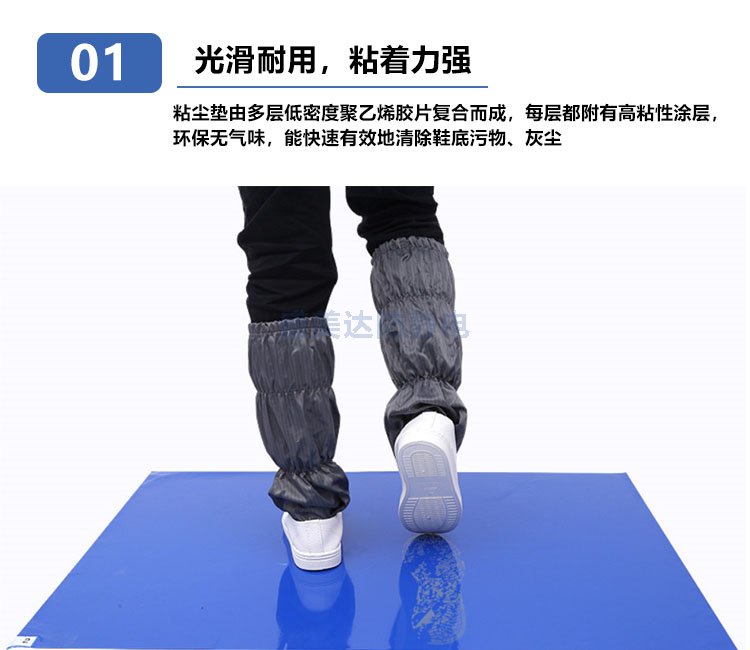 粘塵墊又稱粘塵地墊、粘塵地板膠,采用優(yōu)質(zhì)低密度聚乙烯材料和環(huán)保型壓敏水溶性粘合劑經(jīng)過特殊工藝復合而成,能使粘塵墊每層表面粘性均勻,不掉膠,無氣味,環(huán)保無毒,能快速有效清除運輸工具車輪和鞋底攜帶的灰塵,保持環(huán)境清潔。粘塵墊有30層,每層之間左上角或者右上角都有1-30或者30-1的數(shù)字標簽,以便于更換。主要應用于微電子、半導體、生物制藥,醫(yī)療器械、食品加工和醫(yī)院等各行業(yè)。