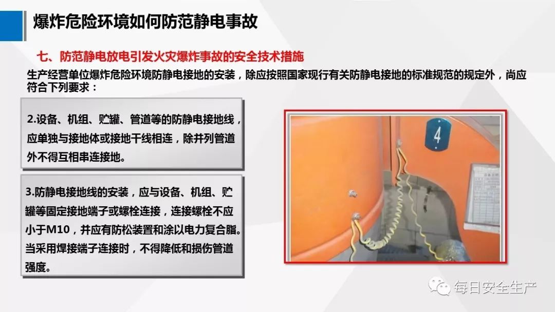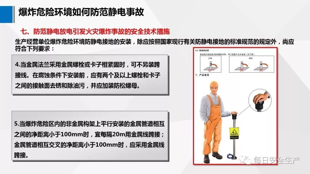 4.1.1 在生產(chǎn)加工、儲運過程中,設備、 管道、操作工具及人體等,有可能產(chǎn)生和積聚靜電而造成靜電危害時,應采取靜電接地措施。