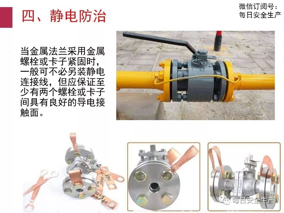 靜電跨接用于消除靜電,防止靜電火花的產(chǎn)生,利用導電性比較好的金屬將兩個法蘭或者閥門法蘭間連接起來,將管道接地,法蘭一般都做防腐造成接觸不良容易產(chǎn)生火花,為了防止事故發(fā)生進行法蘭跨接,給產(chǎn)生的電荷提供泄放的通道。